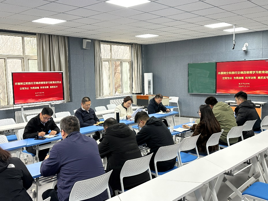 会议对学习教育工作作出具体部署。会议强调,一要坚持学深悟透,各党支部要通过专题学习、研讨交流等形式,深入学习习近平总书记关于正确政绩观的重要论述,在学思践悟中校准思想偏差;二要坚持问题导向,结合学院发展实际,认真查摆问题、深刻剖析原因、制定整改措施,做到学查改贯通;三要坚持实干为要,把学习教育成果转化为推动学院事业发展的实际行动,在人才培养、科学研究、服务航空产业等方面持续发力,务求取得实效。