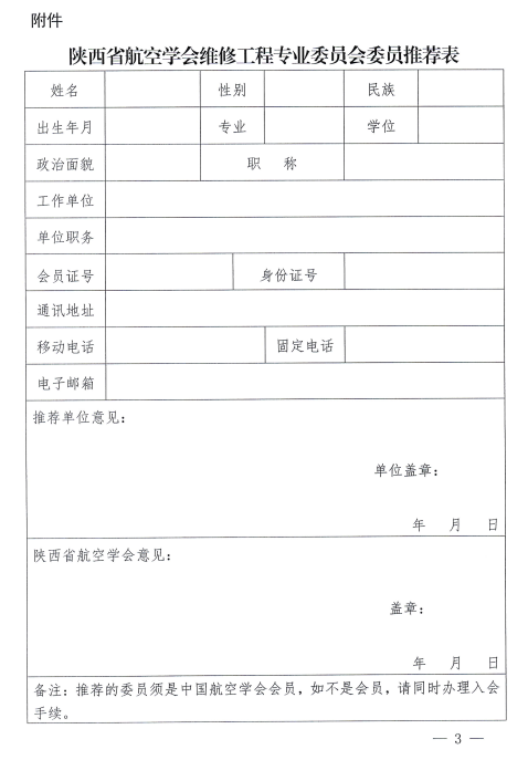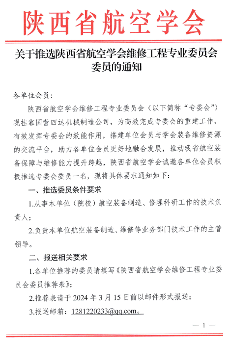 关于推选陕西省航空学会维修工程专业委员会委员的通知