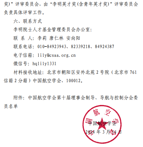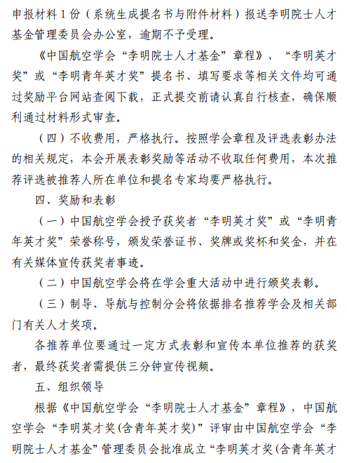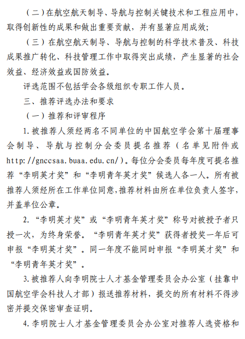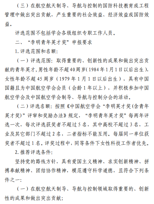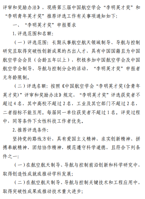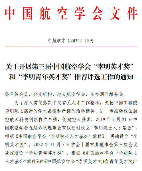 关于开展第三届中国航空学会“李明英才奖(含青年英才奖)”推荐评选工作的通知