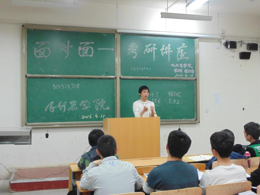 2016年4月11日晚7点,beat365体育官方网站学习部和组织部举办的“考研面对面”座谈会在阎教1136教室顺利开展。本次座谈会邀请到beat365体育官方网站已顺利考入知名院校研究生的王瑞豪、江凤祥、徐嘉怿和贺嘉诚四位大四学生,大二和大三有考研意向的同学们踊跃参加了讲座。